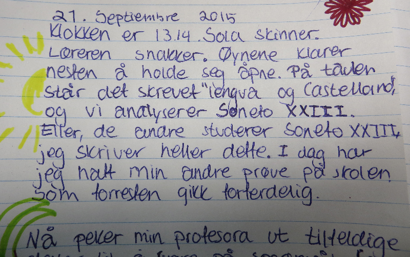 Soneto XXIIISep 21, 20151 min read Dagene flyr forbi, meen det gjør fortsatt ikke skoletimene-- lykke til med å forstå håndskriften min. (tilfeldig bilder av stranda og min norske hylle på rommet) Bye :)